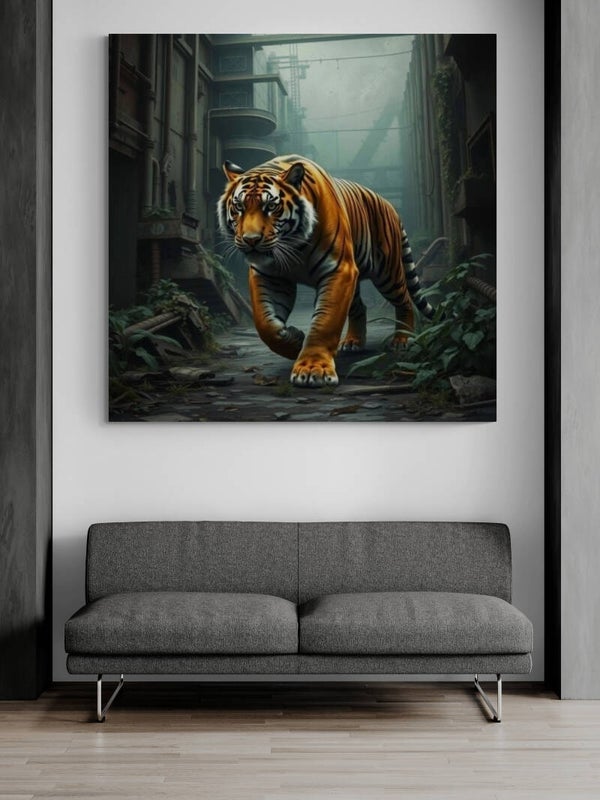 Dit adembenemende schilderij vangt de kracht en schoonheid van een majestueuze tijger die door een verlaten stad wandelt, omringd door weelderige natuur.