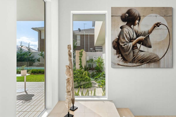 Dit schilderij is een prachtig voorbeeld van hedendaagse street art, met een duidelijke focus op cultuur en elegantie. De zachte kleuren en subtiele details brengen een gevoel van rust en schoonheid in elke ruimte.