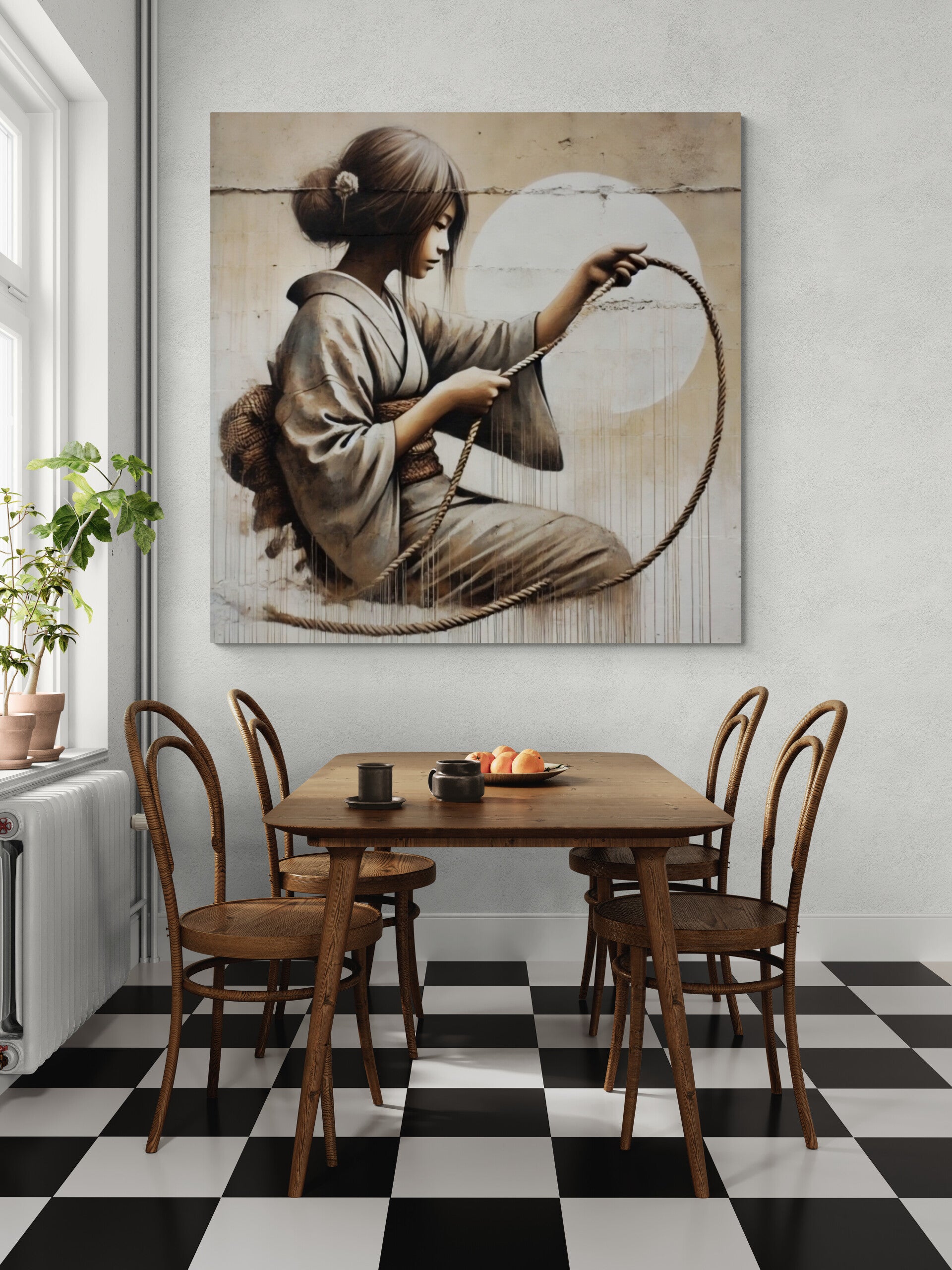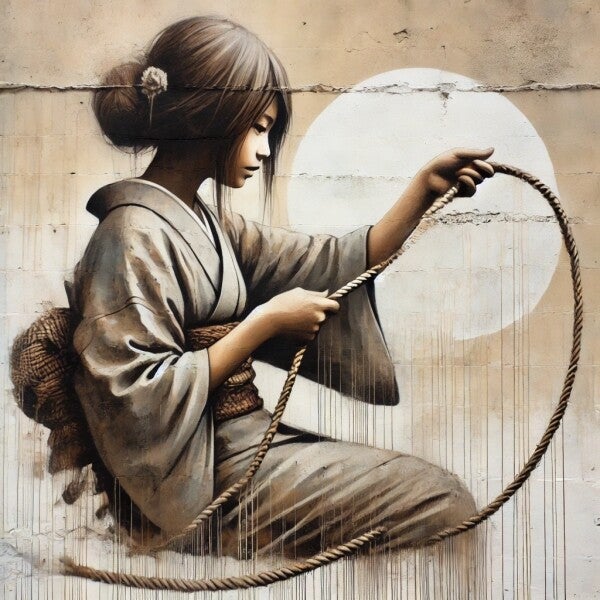 Ontdek de schoonheid van deze unieke muurschildering, die een serene jonge vrouw in traditionele kleding afbeeldt, terwijl ze met een touw speelt.