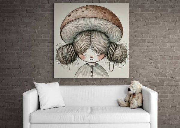 De illustratie toont een schattig meisje met een paddenstoelhoed, perfect voor de kinderkamer, speelkamer of als decoratief accent in een gezellige ruimte.