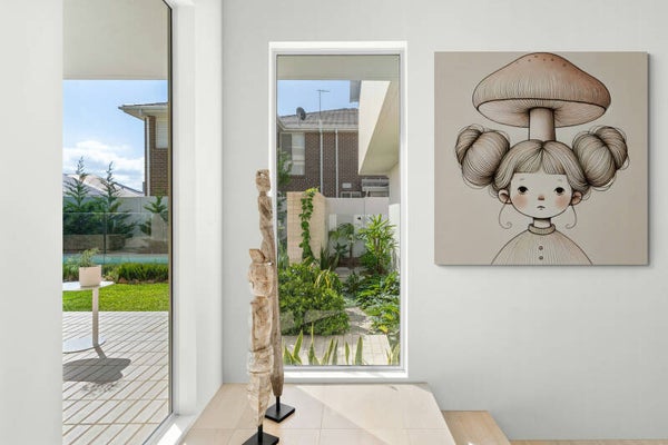 Deze prachtige wanddecoratie toont een betoverend meisje met een grote paddenstoel als hoed, een uniek en magisch design dat perfect is voor de kinderkamer of een speelse woonruimte.