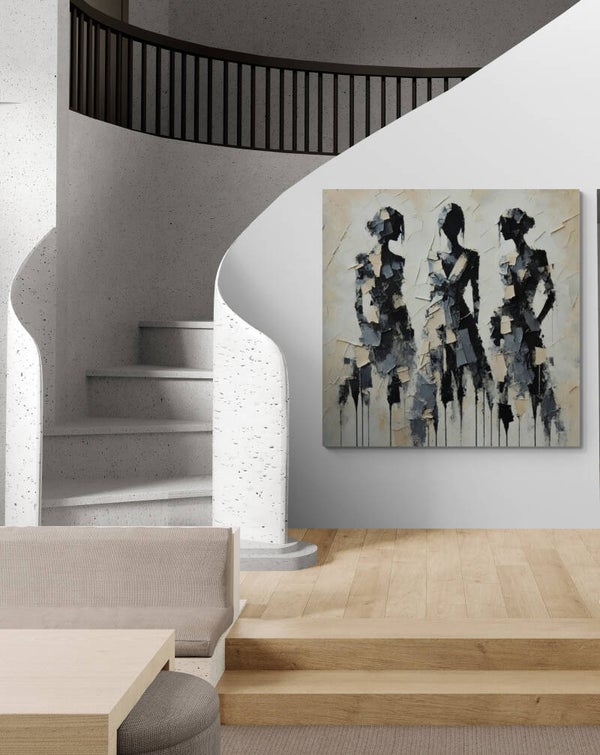 Dit abstracte kunstwerk toont drie vrouwelijke silhouetten in een stijlvolle compositie van donkere en neutrale tinten. De vloeiende vormen en krachtige houdingen brengen een gevoel van zelfstandigheid en verfijning samen.