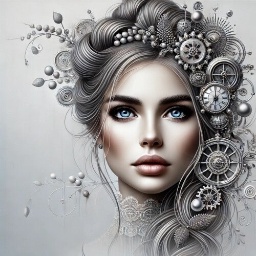 Dit kunstwerk straalt een mysterieuze mix van elegantie en mechanica uit. Het portret toont een vrouw met helderblauwe ogen, omringd door verfijnde details zoals tandwielen, sierlijke ornamenten en een klassieke klok. De combinatie van zachte gelaatstrekken en industriële elementen geeft dit werk een unieke steampunk uitstraling die zowel tijdloos als modern oogt.