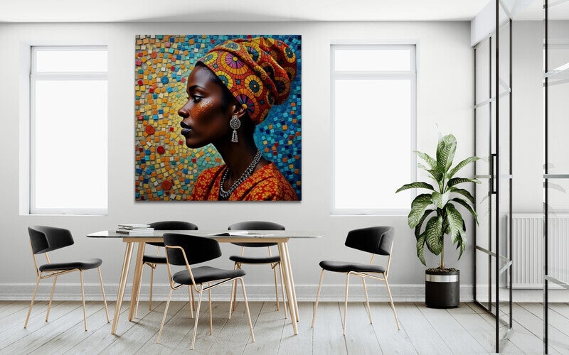 Dit prachtige schilderij, "Kleurrijke Verbondenheid", is een schitterend voorbeeld van culturele expressie en verfijnde kunst. De mozaïekachtige achtergrond, gevuld met een levendig palet van kleuren, straalt dynamiek en energie uit.