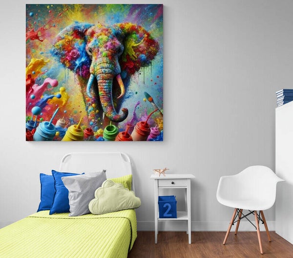 Deze spectaculaire kunstprint brengt een explosie van kleuren en expressie in je interieur! Een imposante olifant, gehuld in een levendige mix van spatten, verf en texturen, springt direct in het oog.