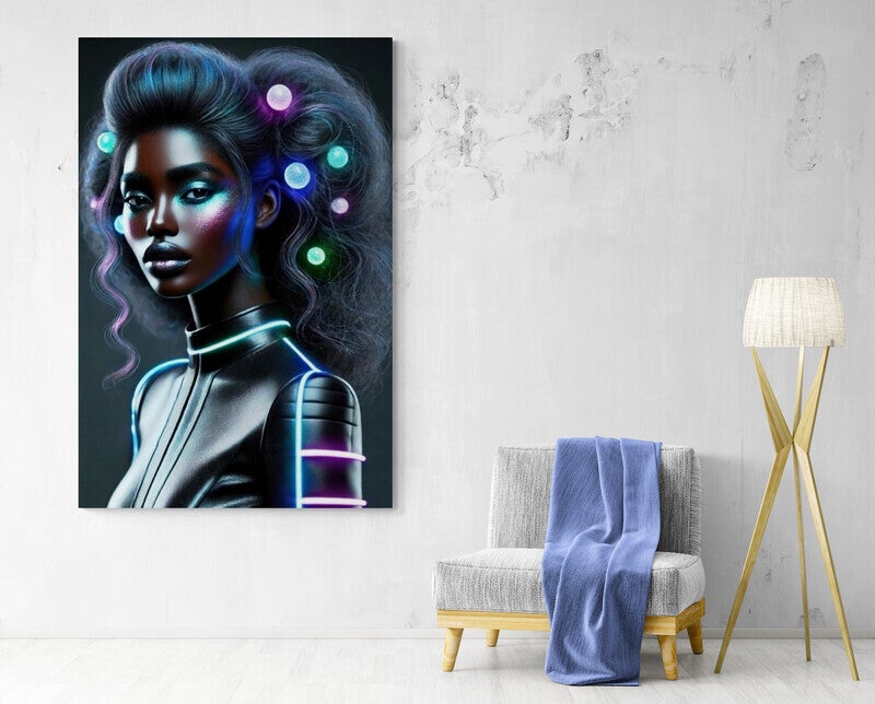 Haar futuristische outfit, met metallic en glanzende elementen, benadrukt de high-tech uitstraling. Dit kunstwerk straalt luxe, mystiek en innovatie uit, een perfecte eyecatcher voor moderne interieurs.
