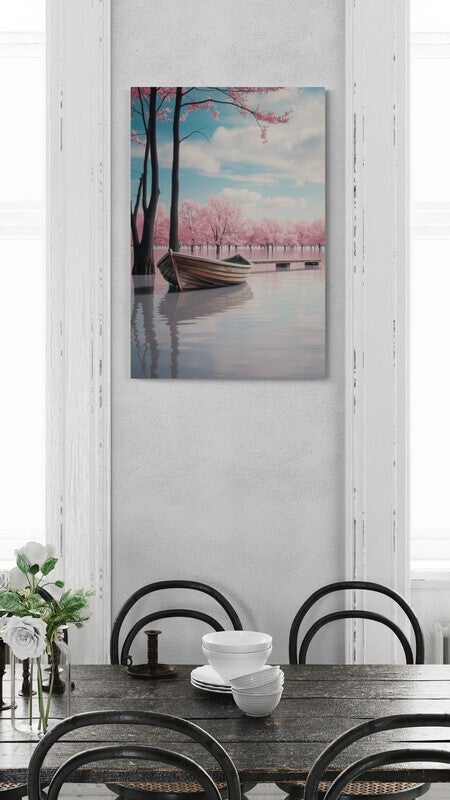 Laat je meenemen naar een betoverend landschap waarin een oude houten roeiboot rustig dobbert op het kalme water. De idyllische omgeving wordt versterkt door een steiger die zich uitstrekt naar het meer en een rij sierlijke bomen met bloesem in dromerige roze tinten. De reflectie van de bomen op het water voegt een bijna magische dimensie toe, terwijl de lucht een zachte mix van blauw en wit toont, met speelse wolken die de sfeer luchtig maken.
