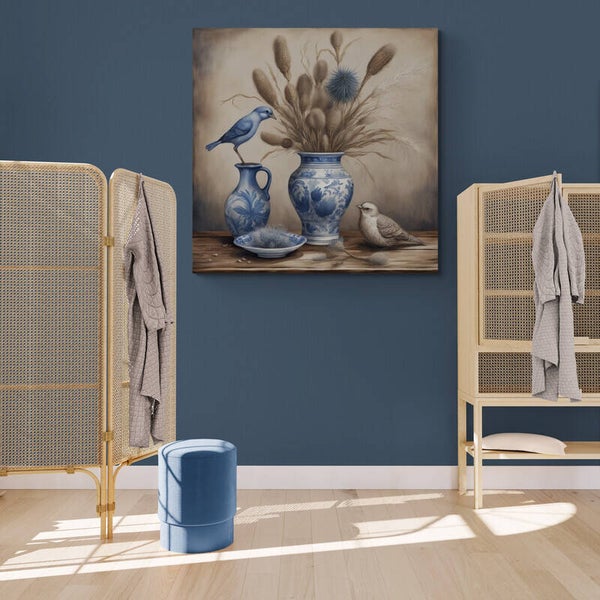 Dit prachtige stilleven vangt de essentie van klassieke Nederlandse kunst, met een moderne twist. De compositie toont twee verfijnde Delfts blauwe vazen met gedetailleerde bloemmotieven, gevuld met een subtiel gedroogd bloemstuk. Op de voorgrond staat een sierlijk porseleinen schaaltje met textuurrijke distels, wat de authentieke sfeer versterkt.