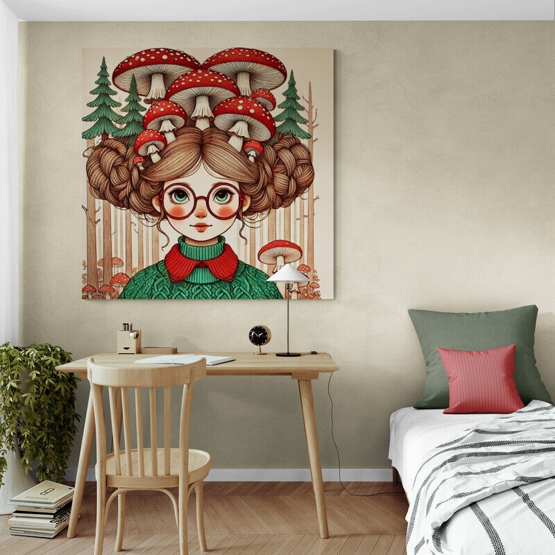 Dompel je onder in een sprookjesachtige wereld met "Paddenstoelenprinses", een uniek kunstwerk dat fantasie en natuur samenbrengt. Dit schilderij toont een dromerig meisje met vlechtkapsels waaruit prachtige rode vliegenzwammen groeien, alsof ze een verlengstuk zijn van haar gedachten. Op de achtergrond strekt een mysterieus bos zich uit, waar kleine en grote paddenstoelen de sfeer van een magisch rijk versterken. Haar warme trui, grote ronde bril en nieuwsgierige blik maken haar een karakter dat tot leven lijkt te komen.