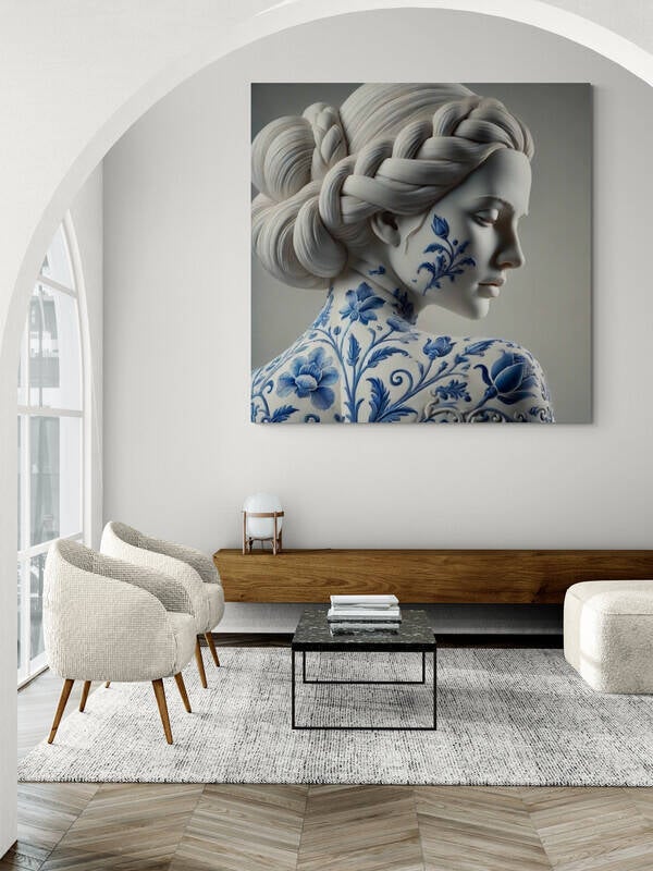 Deze betoverende afbeelding combineert de tijdloze schoonheid van porselein met de delicate finesse van Delfts blauwe kunst. Een elegante vrouw, bijna beeldschoon als een marmeren sculptuur, straalt sereniteit uit. Haar huid lijkt gemaakt van porselein, subtiel versierd met weelderige blauwe bloemmotieven die haar gezicht en schouders sieren. De zachte vlechten in haar haar versterken het klassieke en romantische karakter van het kunstwerk.