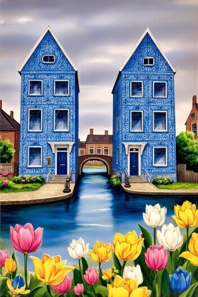 Laat je betoveren door deze idyllische voorstelling van twee blauwgedecoreerde herenhuizen, gescheiden door een kabbelend grachtje en verbonden door een sierlijke boogbrug.