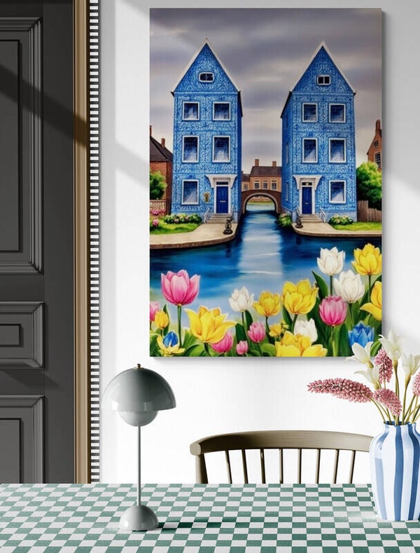 De prachtige Delfts blauwe gevels stralen elegantie en vakmanschap uit, terwijl de kleurrijke tulpen op de voorgrond een levendig contrast creëren. De lucht heeft een zachte gloed, wat de compositie een serene en bijna sprookjesachtige uitstraling geeft.