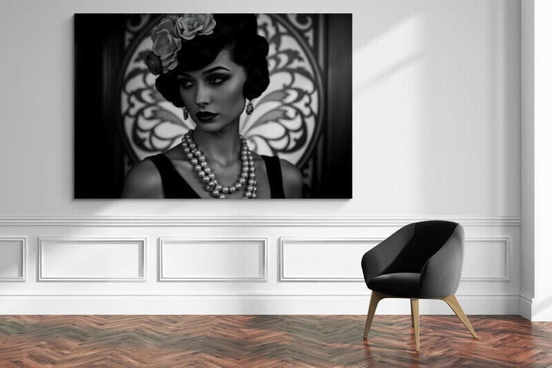 Breng de charme van de jaren ‘20 en ‘30 naar je interieur met dit stijlvolle retro schilderij. Op de afbeelding zie je een mysterieuze vrouw met een verfijnde uitstraling, gekleed in een klassieke zwarte jurk. Haar donkere, golvende haar is prachtig gestyled in vintage finger waves en versierd met elegante bloemen. Met haar parelketting, dramatische eyeliner en gedetailleerde oorbellen straalt ze pure Hollywood-glamour uit. De achtergrond heeft een artistiek patroon dat perfect aansluit bij de luxueuze uitstraling van het schilderij.