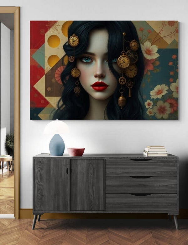 Dit fascinerende kunstwerk toont een intrigerende vrouw met diepblauwe ogen en levendige rode lippen, omlijst door donker golvend haar. Haar elegante uitstraling wordt versterkt door een unieke versiering: antieke klokken en tandwielen die als sieraden in haar haar hangen. De achtergrond combineert een klassieke vintage stijl met florale patronen en geometrische vormen, wat het schilderij een warme, nostalgische uitstraling geeft.