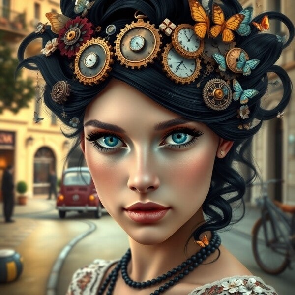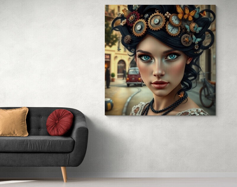 Haar donkere golvende haren zijn versierd met sierlijke tandwielen, vintage zakhorloges en fladderende vlinders, wat een magische steampunk sfeer creëert. De achtergrond, een charmante retro straat met een klassieke Fiat 500 en een nostalgische fiets, versterkt het vintage karakter van dit kunstwerk.