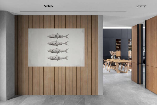 Deze minimalistische wanddecoratie brengt een stijlvolle ode aan de stad Amsterdam. Vier gestileerde haringen zijn horizontaal gestapeld, elk met de iconische drie kruisen van Amsterdam op hun lijf. De zachte grijswitte achtergrond zorgt voor een rustgevende uitstraling, terwijl het grafische element van de kruisen direct de aandacht trekt.