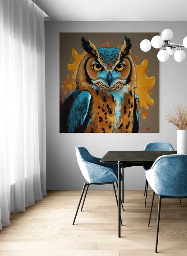 Deze afbeelding barst van de energie! De uil staat krachtig in beeld, met vurige oranje ogen en een imposante blik vol zelfvertrouwen. Wat dit werk echt bijzonder maakt, zijn de speelse oranje verfspatten op de achtergrond. Die geven het geheel een explosieve en kunstzinnige flair.