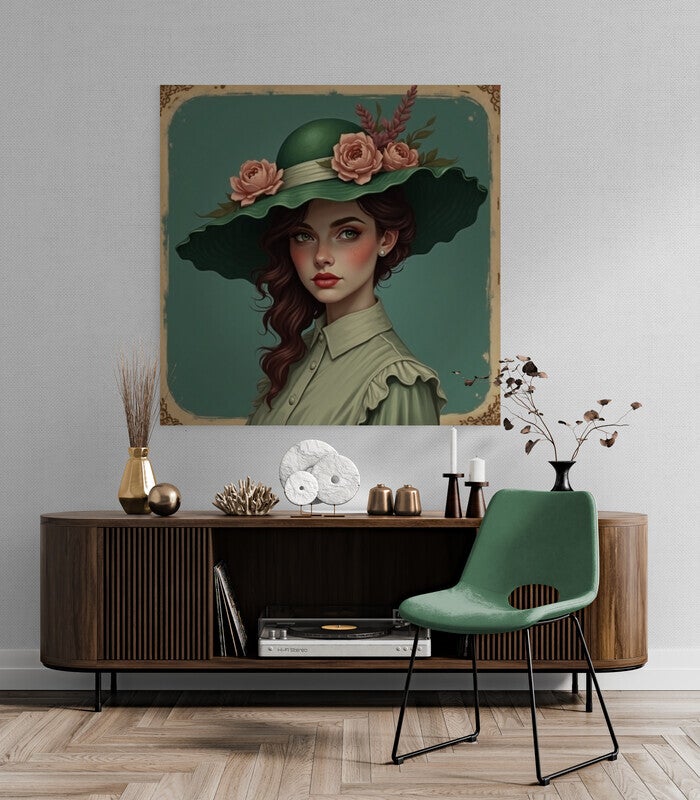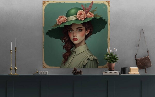 Deze verfijnde wanddecoratie toont een jonge vrouw met een kalme, krachtige uitstraling. Haar groene, wijdgerande hoed is versierd met zachte roze rozen en subtiele herfsttakjes. De combinatie van haar golvende donkerbruine haar, porseleinachtige huid en sierlijke blouse met ruches straalt elegantie en nostalgie uit. Het zachte kleurenpalet van donkergroen en roze zorgt voor rust en warmte.