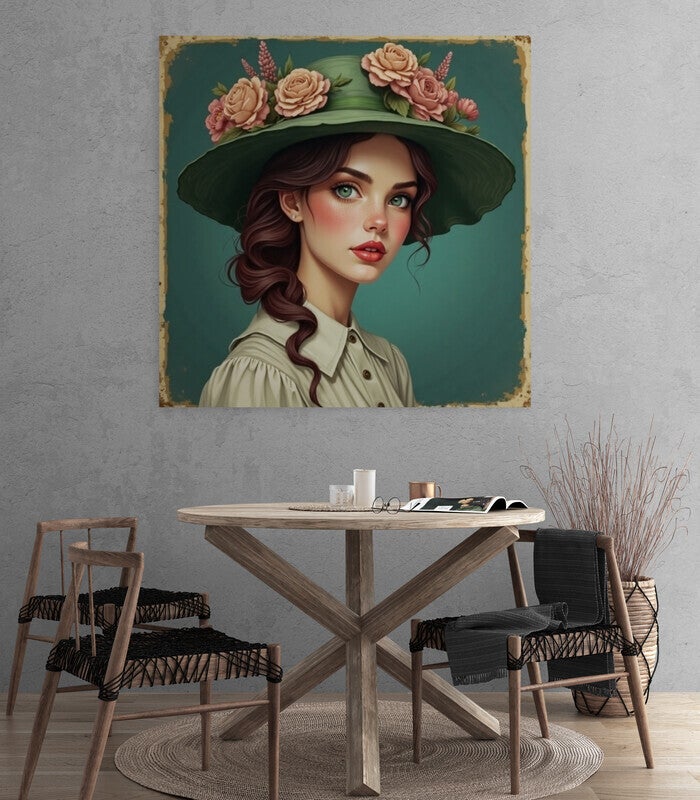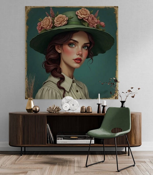 Roséria Verde – Vintage Vrouwenschilderij met Bloemenhoed
