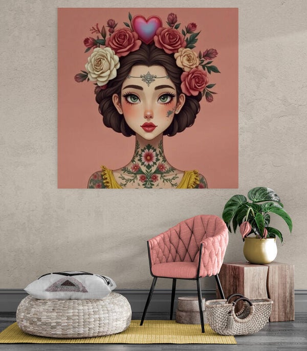 Florale tatoeages op haar hals en schouders geven het kunstwerk een moderne, expressieve uitstraling. De sierlijke diadeem op haar voorhoofd versterkt het dromerige, almost spirituele karakter.