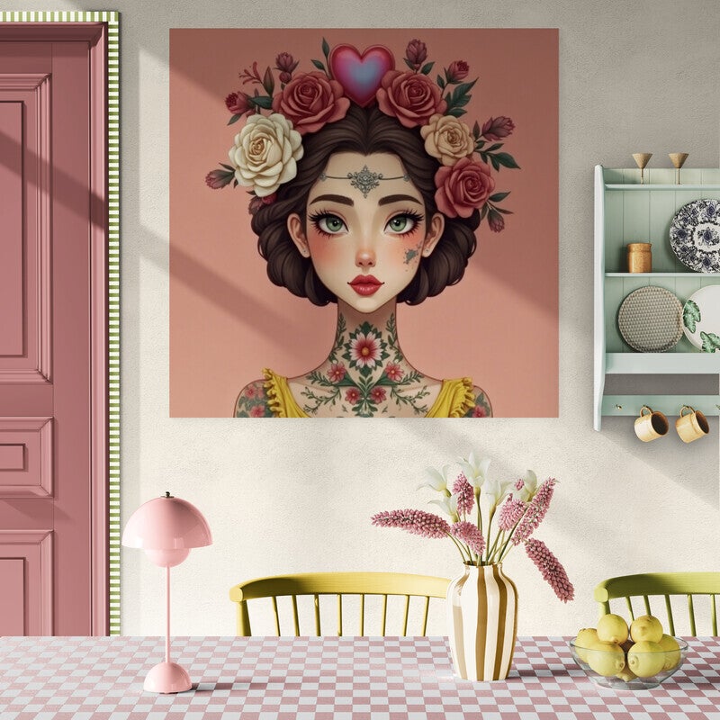 Laat je betoveren door deze unieke kunstprint waarin vrouwelijkheid, expressie en bloemenpracht samenkomen. Op het schilderij zie je een mysterieuze vrouw met grote groene ogen en een elegante, licht nostalgische blik. Haar donkerbruine haar is rijkelijk versierd met bloeiende rozen in zachte tinten crème, bordeaux en blush pink. Een glanzend roze hart boven haar hoofd straalt liefde en zachtheid uit.