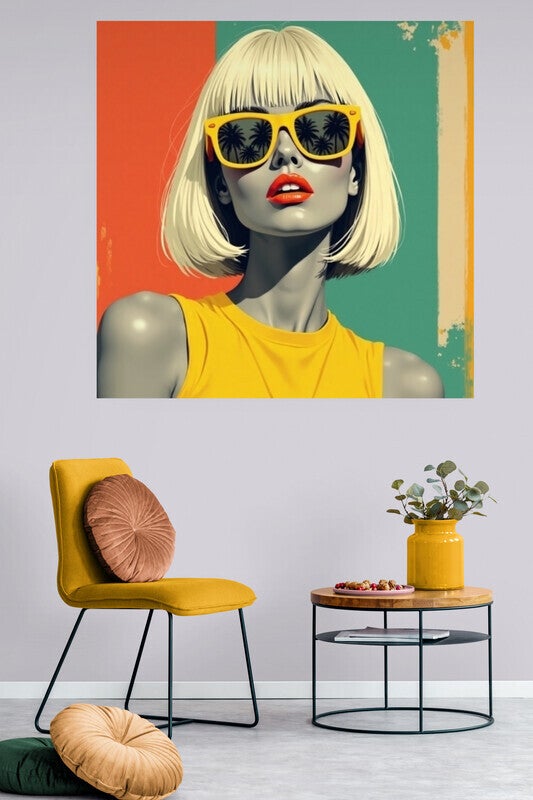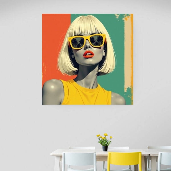 Dit schilderij toont een retro vrouw met een korte blonde bob en een zonnige gele top. De abstracte achtergrond in groen, oranje en beige geeft het kunstwerk een frisse retro uitstraling.