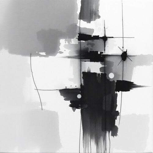 Dit abstracte schilderij heeft een dynamische en moderne uitstraling met een combinatie van zwart, wit en grijstinten. De compositie bestaat uit expressieve penseelstreken, geometrische vormen en vloeiende lijnen die samen een intrigerend visueel effect creëren.
