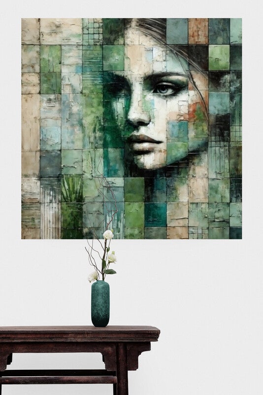 Groene Blik – Vrouwelijk Portret in Abstract Mozaïek