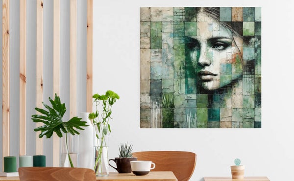 Dit fascinerende schilderij toont een vrouwengezicht dat opdoemt uit een abstract raster van groentinten, beige en aardse kleuren. De krachtige blik en subtiele schaduwen maken het portret bijna levensecht, terwijl de mozaïekstructuur het geheel modern en mysterieus houdt. De combinatie van zachte lijnen en ruwe textuur zorgt voor een gelaagd beeld dat blijft boeien – elke keer dat je kijkt, ontdek je iets nieuws.