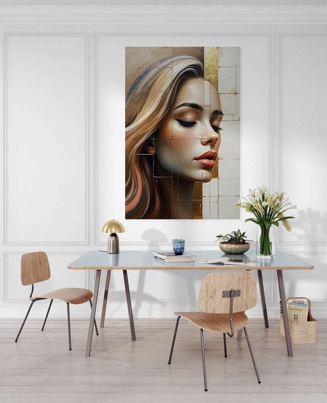 Laat je ruimte spreken met deze betoverende wanddecoratie schilderij van een serene vrouw in abstracte stijl. De afbeelding toont een close-up van een elegant vrouwengezicht met gesloten ogen, zachte make-up en een kalme uitstraling. Wat dit kunstwerk uniek maakt, is de combinatie van hyperrealistische schildertechniek met geometrische abstractie. Het gezicht is onderbroken door rechte lijnen en vlakken, wat het beeld een modern en bijna futuristisch karakter geeft.