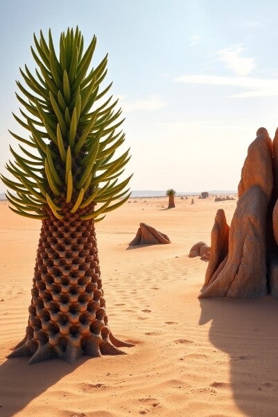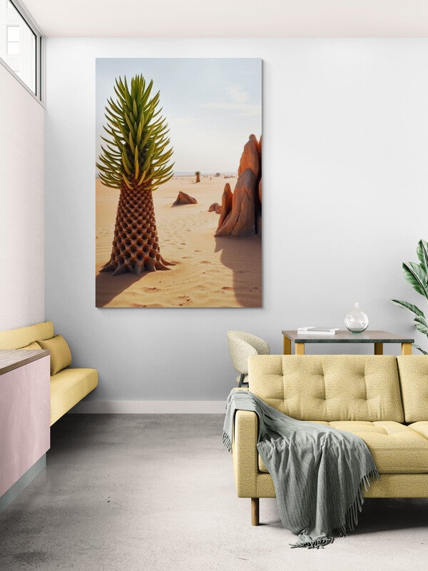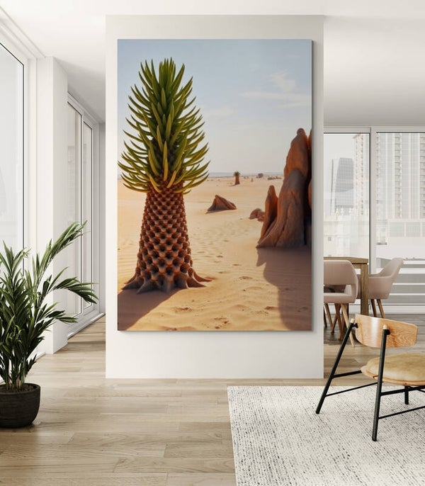 Laat je meevoeren naar een andere wereld met deze unieke wanddecoratie van een betoverende woestijnpalm. Deze kunstprint toont een surrealistisch tafereel: een prachtige, rechtopstaande boom met een perfect geometrisch patroon in de stam en heldergroene bladeren die als vuurwerk naar boven uitwaaieren. De boom staat in een zanderige woestijn vol warme aardetinten, geflankeerd door opvallende rotsformaties die haast buitenaards ogen. De lichtval is zacht en natuurlijk, waardoor deze afbeelding een kalme, spirituele sfeer uitstraalt.