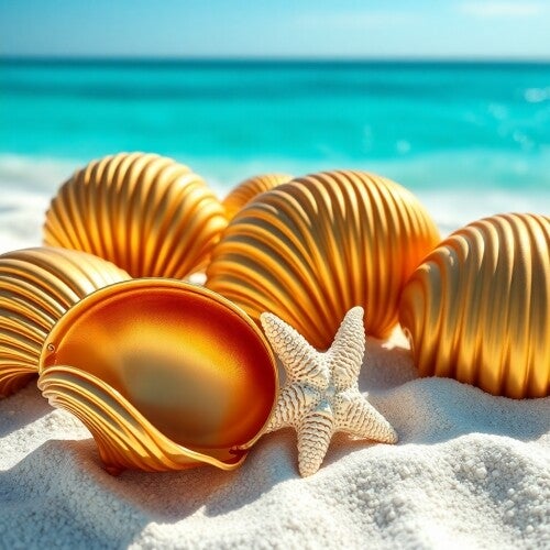 Deze afbeelding toont een groep glanzende, goudkleurige schelpen met een fijne ribbelstructuur, speels neergelegd op helderwit strandzand. Een sierlijke zeester ligt erbij, alsof deze net uit de zee is komen aanwaaien. Op de achtergrond schittert de azuurblauwe zee onder een zonnige hemel. De sfeer is zonnig, warm en stijlvol.