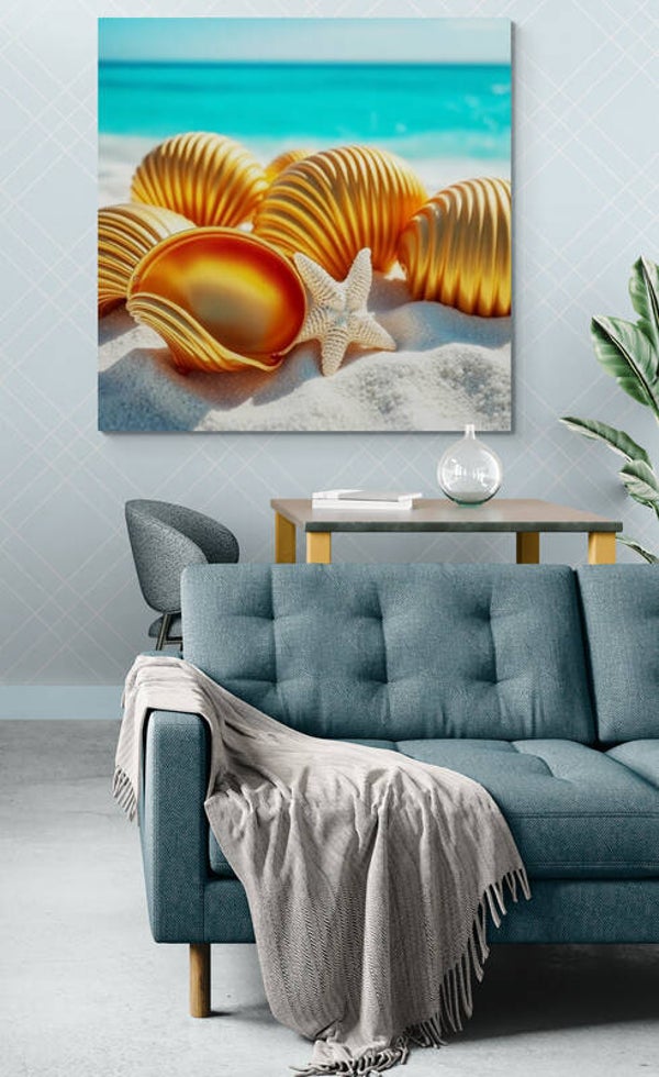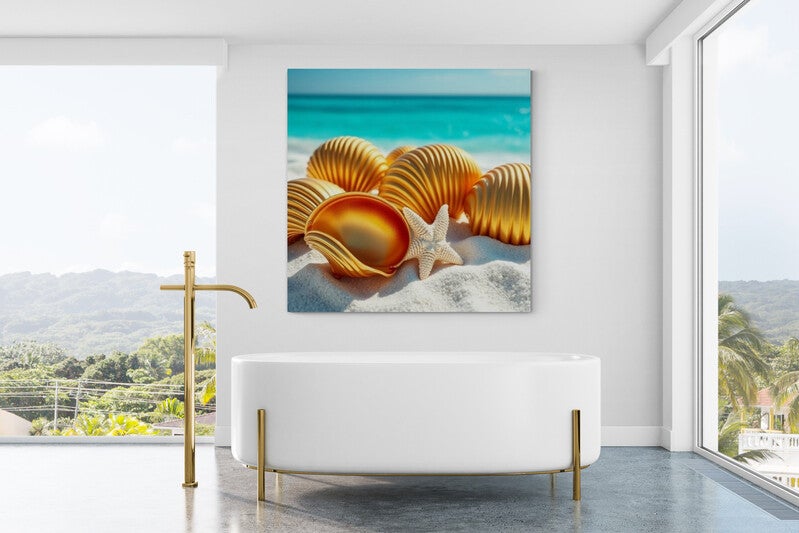 Laat je betoveren door deze opvallende wanddecoratie, waarbij gouden schelpen schitteren op het witte zand onder een helderblauwe hemel. Dit kunstwerk vangt de sfeer van een zonovergoten stranddag in een luxueuze en moderne stijl. De combinatie van goudkleurige schelpen en een zeester tegen een achtergrond van turquoise oceaan creëert een gevoel van rust, vakantie en elegantie.