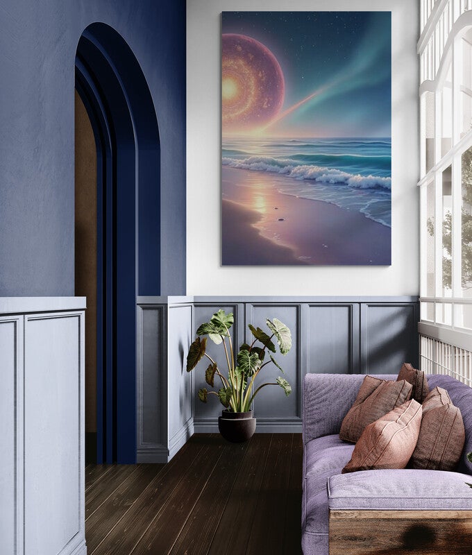 Dit schilderij past goed in interieurs waar stilte, sfeer en een gevoel van openheid centraal staan, zoals een rustige woonkamer, slaapkamer of een plek voor ontspanning.
