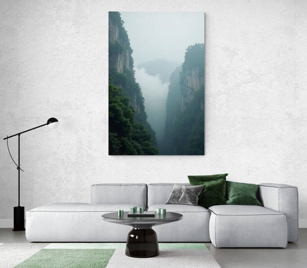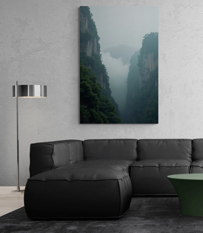 Deze mysterieuze afbeelding toont een diepe kloof die zich opent tussen twee steile bergwanden, gehuld in een sluier van nevel. De mist die tussen de rotsen hangt geeft het beeld een dromerige en bijna spirituele uitstraling. Je waant je even in de verborgen wereld van Aziatische gebergten, waar stilte en mystiek de boventoon voeren.
