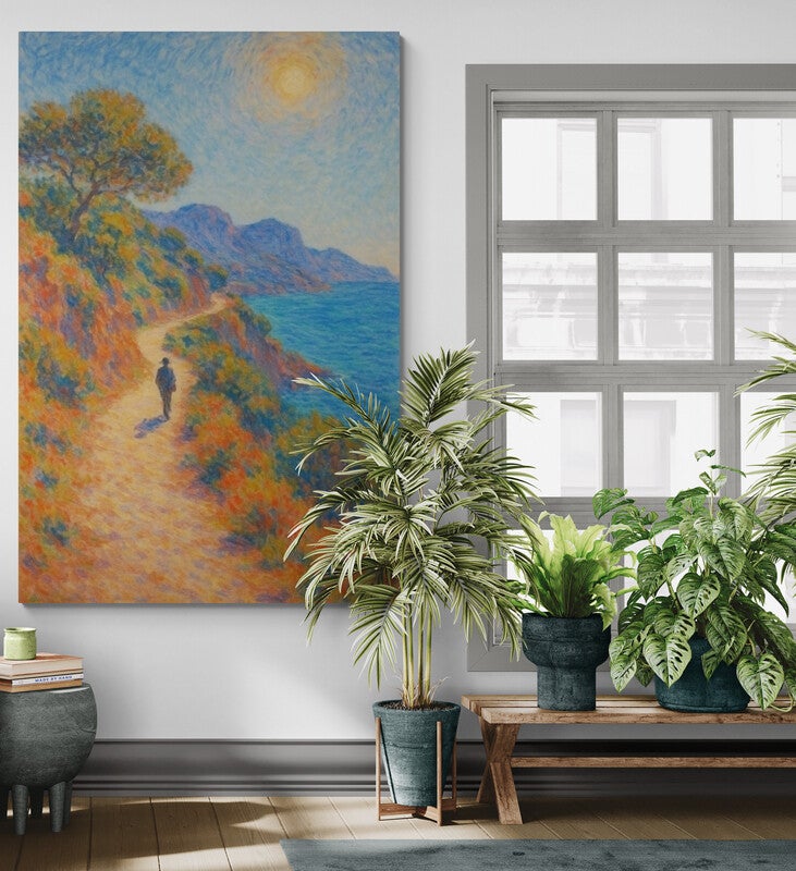 Breng de warmte van de zon en de sereniteit van de natuur in huis met dit impressionistische wanddecoratie schilderij. De afbeelding toont een wandelaar op een zonovergoten pad langs de kleurrijke kustlijn, omringd door bloemen, struiken en een kalme zee. De stijl doet denken aan Monet en van Gogh, met zachte penseelstreken, levendige kleuren en een dromerige sfeer.