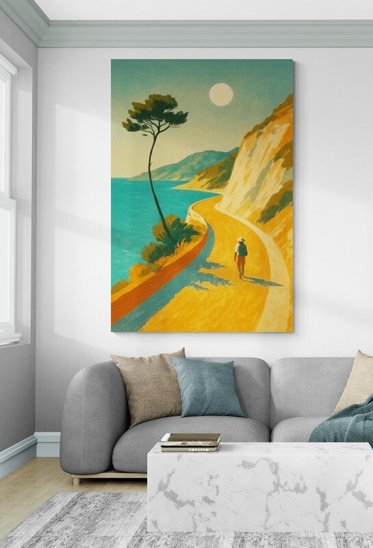 Dit moderne wanddecoratie schilderij toont een wandelaar op een kronkelend pad langs de zee, omringd door hoge rotsen en een eenzame boom onder een volle zon. De stijl is grafisch en gestileerd, met heldere kleurvlakken in okergeel, diepblauw en warmgroen.
