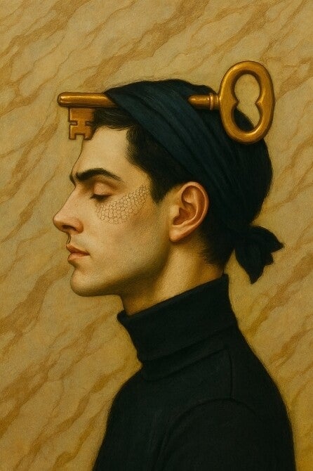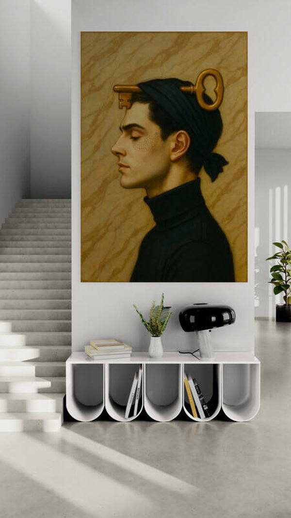 Laat mysterie en introspectie samenkomen met dit krachtige mannenportret schilderij met gouden sleutel. De man in zijprofiel straalt stilte en controle uit, met een klassieke sleutel op zijn hoofd – als symbool voor toegang tot innerlijke werelden, gedachten of geheimen. Een subtiel en sterk beeld met een diepere laag.