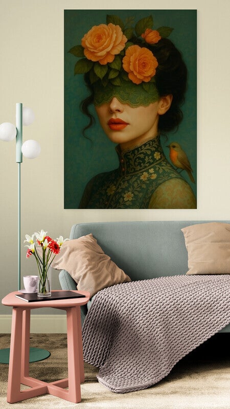 De aanwezigheid van een schattig roodborstje op haar schouder voegt een natuurlijk en teder accent toe. Perfect voor wie houdt van kunst met een dromerige, surrealistische en botanische uitstraling.