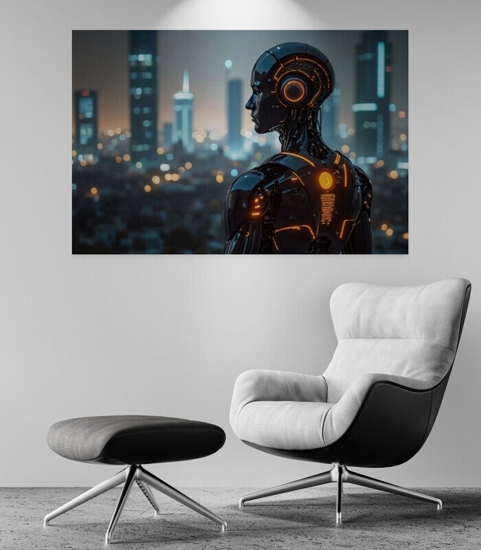 Een futuristisch silhouet van een androïde figuur, verlicht door oranje energiecircuits, staart over een stadslandschap vol lichtpuntjes. Het ontwerp combineert technische perfectie met een gevoel van rust en observatie. De reflecties op het gladde oppervlak en de geometrische vormen in de stad versterken het sciencefictionkarakter van dit werk.