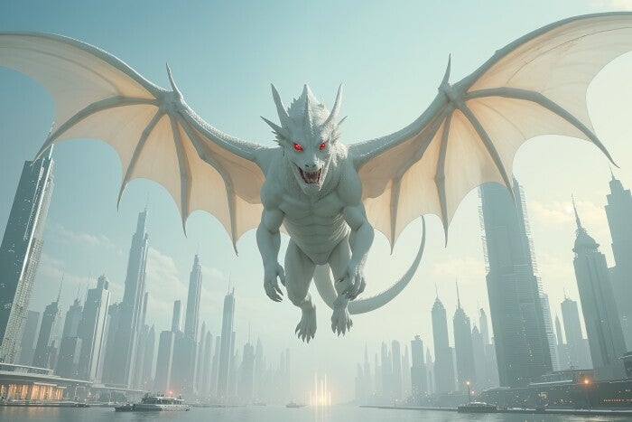 Sky Dominion toont een witte draak met rode ogen in volle vlucht, dreigend en majestueus boven een moderne wereldstad. Zijn imposante vleugels en grommende houding maken hem tot een echte heerser van de lucht.