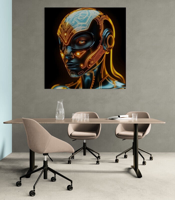 Een krachtige digitale vrouw met een maskerachtig gezicht, bedekt in futuristische oranje lichtlijnen die gloeien tegen een donkere achtergrond. Haar blik is intens en hypnotiserend, vol mysterie en technologie. Dit werk is een echte eyecatcher voor liefhebbers van sci-fi, neonstijlen en moderne kunst.