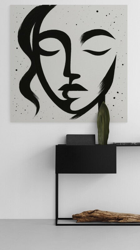 Silent Grace is een tijdloos kunstwerk met een serene uitstraling. Dit minimalistische portret in zwart-wit toont het gezicht van een vrouw met gesloten ogen, gevormd door elegante penseelstreken en zachte rondingen.