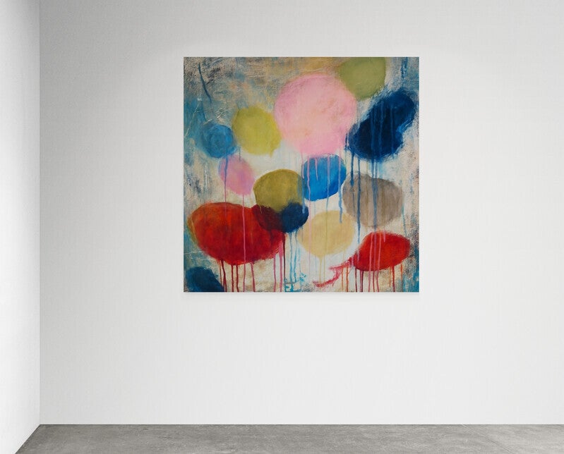 Color Drops is een expressief abstract schilderij met een speelse compositie van kleurrijke verfballen en druipende lijnen. Deze moderne kunstprint straalt creativiteit en beweging uit en is perfect als opvallend middelpunt in jouw interieur. De ruwe achtergrondtextuur en zichtbare penseelstreken geven het geheel een authentieke artistieke sfeer.