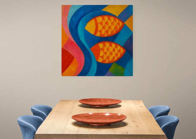 Vissenstroom in Kleur is een levendig abstract kunstwerk waarin twee gestileerde vissen in warme oranjetinten sierlijk meebewegen met golvende lijnen van blauw, roze en geel. Dit werk is een explosie van kleur, perfect om energie en dynamiek in een ruimte te brengen. De vloeiende vormen suggereren beweging, stroming en leven, zonder in realisme te vervallen.