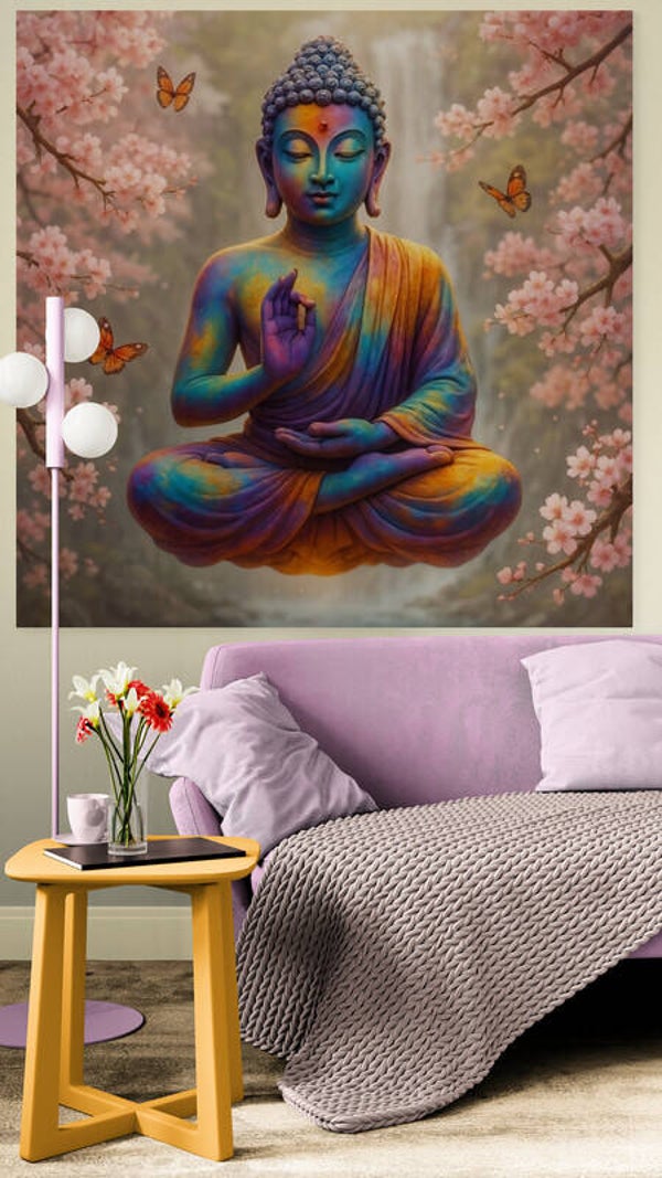Zen Spectrum is een magische, spiritueel geladen kunstwerk van een Boeddha-beeld in levendige regenboogkleuren. De Boeddha zweeft in een serene lotushouding tussen bloeiende kersenbloesems en dansende vlinders. Op de achtergrond verschijnt een zachte waterval, wat het werk een ultieme rust en natuurlijke balans geeft. Dit werk straalt mindfulness en harmonie uit, perfect voor meditatieruimtes of rustige interieurs.