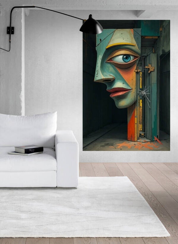 Surrealistisch gezicht met geometrische vormen en mechanische details. Digitale kunst vol mysterie, perfect voor moderne interieurs met karakter.
