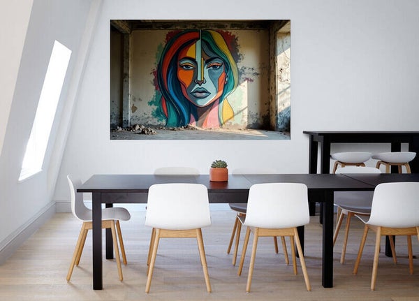 Deze urban muurschildering toont een expressief vrouwenportret opgebouwd uit kleurrijke abstracte vlakken. Elk kleurvlak lijkt een emotie te vangen, waardoor het werk zowel speels als krachtig overkomt. De verfbladeren en imperfecte muur versterken het rauwe karakter van dit streetart kunstwerk. Ideaal voor liefhebbers van felle kleuren, geometrische vormen en vrouwelijke kracht in een modern jasje.