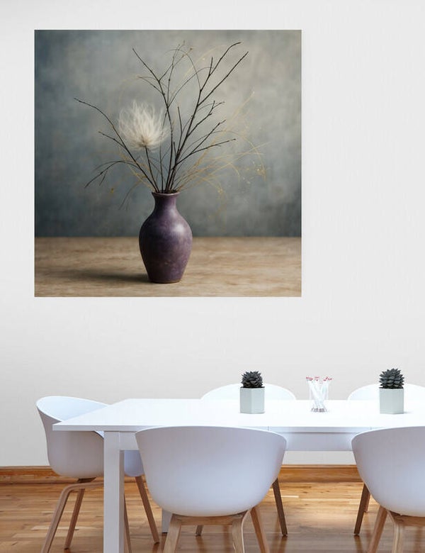 Whisper of Winter is een sereen en poëtisch kunstwerk dat de verstilling van een winterochtend vangt. Een enkel pluizig element zweeft tussen fijne twijgen en gouden sprieten in een diep paarse vaas. De achtergrond in zachte grijstinten versterkt het gevoel van stilte, rust en vergankelijkheid. Een schilderij dat spreekt in fluisteringen en perfect is voor liefhebbers van minimalistische schoonheid.