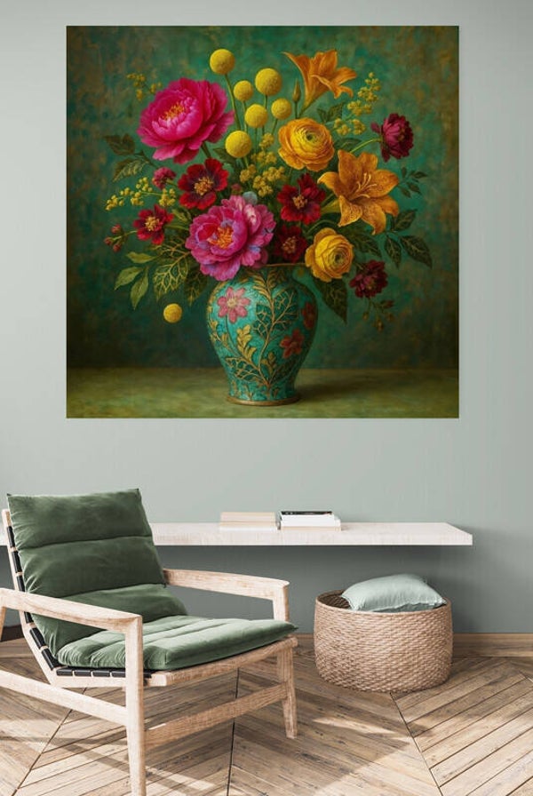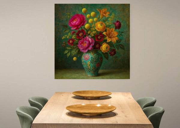 Een explosie van kleur en elegantie komt samen in dit kunstwerk, waarin een turquoise vaas met sierlijke patronen is gevuld met een overvloed aan bloemen. Dieproze pioenen, gele ranonkels, oranje lelies en kleine rode accenten zorgen voor een warme en luxe uitstraling. De geschilderde achtergrond in groen- en goudtinten versterkt de klassieke sfeer.